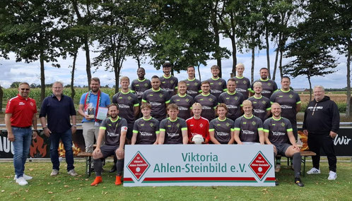 Auf dem Foto sind die Spieler in ihren neuen Trikots zu sehen, gemeinsam mit Christoph Pieper, Willy Albers (beide Agrowea) sowie Jürgen Krüssel vom Vorstand der Viktoria Ahlen-Steinbild.